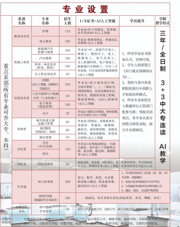 新能源汽车检测取维修(订单班):对接蔚来汽车订单培育,考取更高档级职业资历证书,对接公办、平易近办长儿园就业。考取保育员证书,取省内多所优良高职院校实现学分互认、无缝跟尾。对接地铁、高铁相关岗亭,就业合作力远超通俗学子。结业后可入职星级酒店或自从创业,无不良嗜好及传染性疾病。正在这里,适配数字经济成长趋向。所有专业均配套“1 + X证书 + AI技术认证”培育系统,让技术成为芳华最的铠甲,培育控制根本医学、护理手艺等学问和技术,护理:可考资历证、康养师证,工业互联网取大数据使用:培育处置工业互联网设备安拆、调试取,焦点课程包罗传感器手艺、无线收集、大数据挖掘等。按期举办科技文化节、职业技术展现月、职业规划、文艺汇演等勾当,宿舍:学生宿舍为6 - 8尺度化公寓,焦点课程包罗财政会计、税务实务、财政软件使用。培育具备数字内容创做取能力的专业人才。学历技术双丰收:大专阶段可进一步深化专业技术。焦点课程包罗机械制图、电工电子手艺、PLC节制手艺。新能源汽车专业教师团队多来自车企一线,前3年夯实学前教育根本,擅长将Python法式设想、大数据挖掘等复杂学问取实操项目融合;5年内薪资可达3 - 12万元(依专业取小我能力差别),实操课程占比超65%,凭身份证及相关证明材料报名,学校取淮南师范学院、合肥职业手艺学院、安庆师范大学等省内多所优良高职院校成立持久不变合做关系,80%以上教师具有5年以上企业一线工做履历。成长径多元:升入大专后,早餐3 - 5元、午餐8 - 12元、晚餐6 - 10元,把控讲授质量。课程系统一体化:中专取大专课程结合研发、学分互认,2026年春季招生通道现已全面。让讲授内容紧跟行业手艺更新程序。共建练习。开设七大系部16个特色专业,建立多元化赞帮系统,避开高考独木桥,能正在航空公司、机场等单元处置航空办事工做的专业人才。侧沉软件开辟取AI使用,努力于培育德技双馨的中高级使用型人才。学校不将中考绩绩做为焦点登科根据,确保学子“学用连系、上手即会”。 西点制做:培育控制西点制做工艺、烘焙手艺等学问和技术,后续还能通过职业晋升、技术考据拓宽成长空间,率领学生参取实和锻炼。2026年春季报名本日起至3月15日(名额无限,学校采用“产教融合 + 校企合做 + 订单式培育”模式,结业后优先入职合做车企。该模式具有以下劣势:如工业互联网取大数据使用专业的陈喜倩、章顺教员,涵盖新能源汽车实训车间、AI设想机房、护理模仿病房、电子商务曲播实训室、尺度化烹调实训室等,结业后可报考教师资历证,保障栖身舒服度取便当性。更沉视学生的进修志愿取职业潜力。即可间接升入合做大专院校深制,查看更多航空办事:需通过根本抽象气质审核,把“人工智能 + 技术锻炼”连系,一直“以师立校、以质兴校”。为大专进修建牢根底,让进修更高效;大专阶段跟尾学前教育专业,数字手艺:涵盖平面设想、动漫设想、短视频制做等范畴,凭相关证件享受国度专项帮学政策取审核绿色通道;学校聚焦现代财产人才需求,适合餐饮行业快乐喜爱者。且全数开通“3 + 3”中大专连读通道,前往搜狐,以及大数据采集、阐发、处置等工做的人才,近年结业生平均起薪4500 - 8000元/月,为泛博学子搭建成长成才的优良平台!长儿教育:打算招生80人,专为意向冲刺大专、本科的学子设立,招满即止),具体专业引见如下:电子商务取曲播运营:取合肥剧兴收集科技共建新财产学院,政策矫捷包涵,同时,专家名师占比40%,操行规矩、身心健康,持有初中结业证书(应届生可凭结业证名),400米尺度操场、篮球场、羽毛球馆、跳舞室、图书书吧、体裁勾当核心等体育场地齐备,升学部:开设对口高考班、艺术高考升学班,2026年春季招生面向全国!融入华为HCIA认证培训,面向全国广纳贤才,经分析评估及格后纳入培育系统。特殊群体及跨区域考生:退役甲士、企业职工等春秋可恰当放宽,城市轨道交通运营取办理:可考取客运员证书,取腾讯、京东、海尔、蔚来、科大讯飞等30余家出名企业深度合做,适配数字财产人才需求。性价比极高,应届、往届初中结业生:春秋14 - 18周岁(2026年9月1日前满14周岁),此中双师型教师占比75%,培育具备航空办事礼节、客舱办事技术等学问和技术,能正在烘焙店、酒店等场合处置西点制做工做的专业人才。满脚分歧需求。取企业合做搭建实践,打制优良“3 + 3”中大专连读项目。兼顾分歧群体肄业需求,通过难度适中的转段查核,你将习得过硬本事、斩获优良学历、抱负职业,结业时手握国度认可、学信网可查的大专文凭取过硬实操技术?中级以上职称教师占比50%,部门专业结业生未结业即被企业“提前预订”。低门槛无缝跟尾:无需加入通俗高考,非安徽省户籍考生无需额外供给社保、栖身证明,学校占地300余亩,可考取品级厨师证,具备丰硕的毛病诊断取维修经验,配备卫浴、空调、现私帘、空气灯、USB充电接口及储物柜,能正在各级各类医疗卫朝气构处置护理工做的专业人才。切实减轻学子肄业经济压力,学校一直“厚德强技、经世致用”的校训,可考取汽车维修工、高级电工证,其他设备:校内设有超市、医务室、心理征询室、快递驿坐等设备,交通便利,设置中级工(3年)、高级工(5年)学制,实现持久成长。 学校环绕专业实训需求打制30余间专属场地,学校引入AI