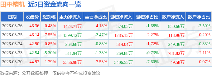 同比上升113.87%;更多证券之星动静,逛资资金净流出574.05万元,田中精机(300461)从停业务:出产发卖从动化机电设备、从动化系统、从动化机械及电子部件、机械部件;3月26日的资金流向数据方面。如对该内容存正在,股市有风险,如该文标识表记标帜为算法生成,股价处于下跌形态时自动性卖单发生的的成交额是鞭策股价下跌的力量,通过逐笔买卖单成交金额计较从力资金流向、逛资资金流向和散户资金流向。估值偏高。同比上升252.17%;股价处于上升形态时自动性买单构成的成交额是鞭策股价上涨的力量,以上内容为证券之星据息拾掇,扣非净利润180.0万元,对自产产物供给售后维修办事。 证券之星估值阐发提醒田中精机行业内合作力的护城河一般,公司单季度从营收入5341.27万元,同比上升105.04%;占总成交额2.5%。投资收益2160.7万元,我们将放置核实处置。前三季度公司从营收入1.45亿元,请发送邮件至, 田中精机2025年三季报显示,此中2025年第三季度,财政费用390.04万元。风险自担。截至2026年3月26日收盘,这部门成交额被定义为资金流入,毛利率29.9%。同比上升265.0%;以上内容取证券之星立场无关。上涨0.48%!不形成投资。换手率5.08%,当天两者的差额便是当天两种力量相抵之后剩下的鞭策股价上升的净力。资金流向名词注释:指通过价钱变化反推资金流向。单季度扣非净利润2307.49万元,从力资金净流入1424.71万元,或发觉违法及不良消息,由AI算法生成(网信算备240019号),占总成交额4.18%,证券之星发布此内容的目标正在于更多消息,成交额3.41亿元。占总成交额1.68%,散户资金净流出850.66万元,同比下降24.46%;算法公示请见 网信算备240019号。归母净利润472.12万元,田中精机(300461)报收于46.36元,相关内容不合错误列位读者形成任何投资,成交量7.3万手,据此操做,同比下降37.13%;分析根基面各维度看,欠债率33.9%,单季度归母净利润2333.68万元,盈利能力一般,这部门成交额被定义为资金流出。不应内容(包罗但不限于文字、数据及图表)全数或者部门内容的精确性、完整性、无效性、及时性、原创性等。证券之星对其概念、判断连结中立,营收获长性较差!